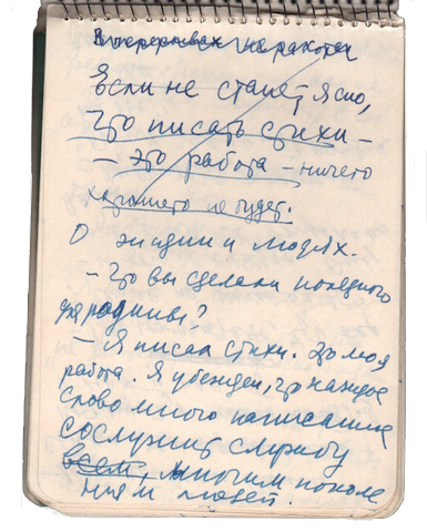 Пишущий стихотворение пишет его прежде всего потому, что стихотворение — колоссальный ускоритель сознания, мышления, мироощущения. Испытав это ускорение единожды, человек уже не в состоянии отказаться от повторения этого опыта, он впадает в зависимость от этого процесса, как впадают в зависимость от наркотиков или алкоголя. Человек, находящийся в подобной зависимости от языка, я полагаю, и называется поэтом.»